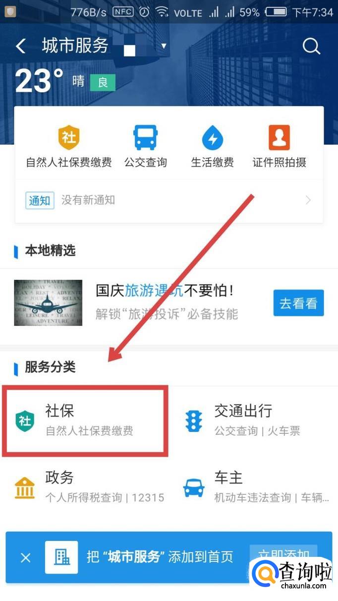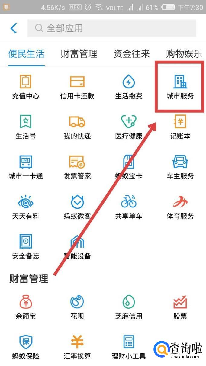 然后向下翻,在【便民生活】下面找到【城市服务】,点击进入。
