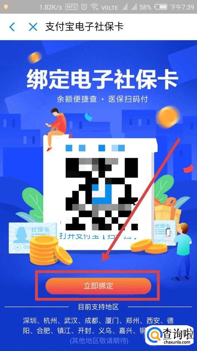 然后点击界面下方的【立即绑定】,目前只有部分城市可以绑定社保卡,可以绑定社保卡的城市如图所示。