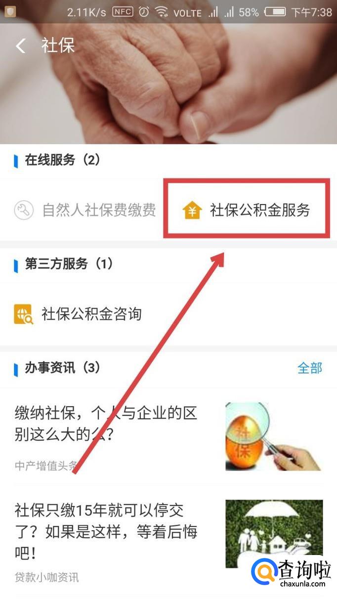 然后在界面上方找到【社保公积金服务】,点击进入。