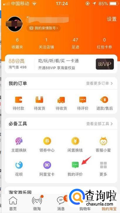 首先我们登录手机淘宝后在我的页面里找到我的评价功能并点击进去。