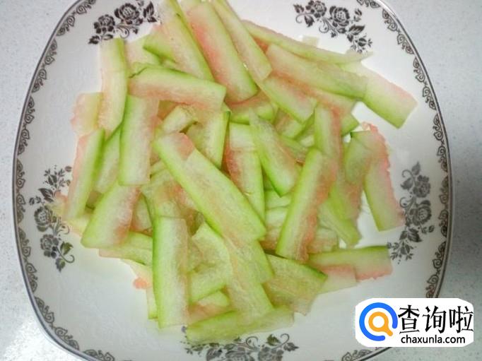 西瓜皮去除绿色硬皮和多余的瓜瓤,用水清洗干净,控干水分,切成薄片。
