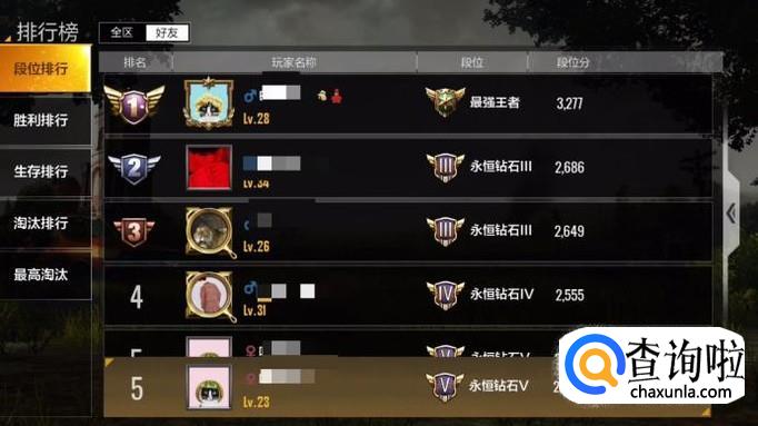 第一个排行是段位排行,依次是王者、钻石、铂金、黄金、白银和青铜。