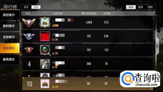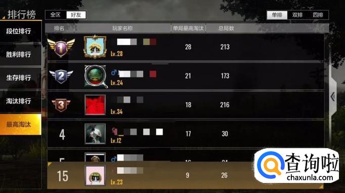 第四个排行是淘汰排行,也分为单排、双排和四排,有累计淘汰数目和总局数的数据。