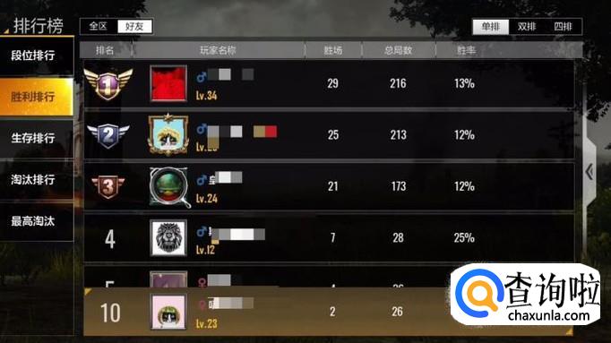 第二个排行是胜利排行,分为单排、双排和四排的胜利排行。