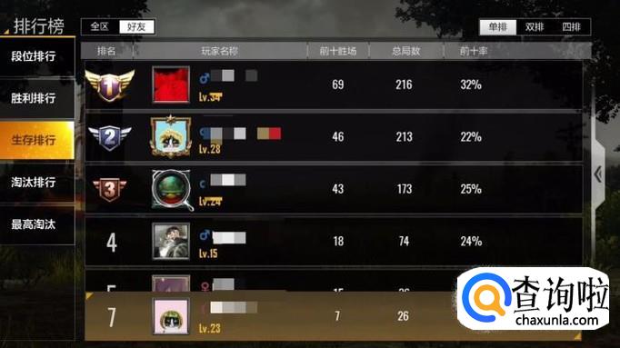 第三个排行为生存排行,也分为单排、双排和四排,有前十胜场、总局数和前十率的数据。