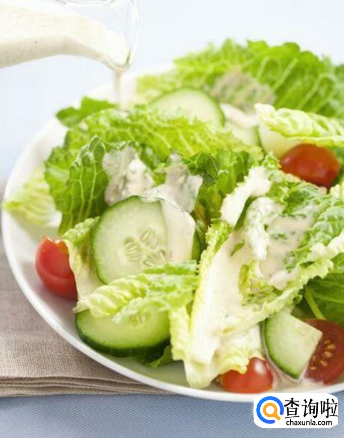 蔬菜沙拉。美味可口的沙拉酱可以使普通的水果和蔬菜顿然生色,变幻出各种诱人的味道。