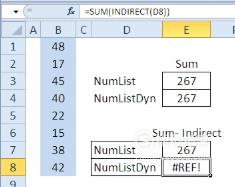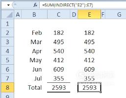 在单元格E8中,INDIRECT函数创建对开始单元格E2的引用:=SUM(INDIRECT(“E2″):E7)。