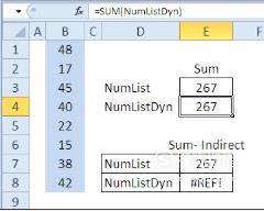 创建对静态命名区域的引用,INDIRECT函数也可以创建对命名区域的引用。在本例中,蓝色单元格区域被命名为NumList,在列B中也有一个基于该列的数值数的动态区域。通过在SUM函数中使用区域名称,每个单元格都能够计算总和,正如在单元格E3和E4中所看到的。=SUM(NumList) 或 =SUM(NumListDyn)。