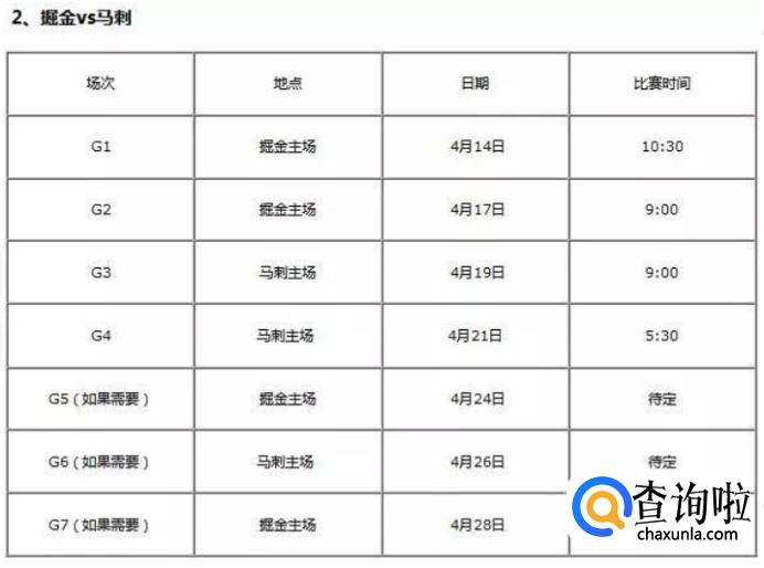前两场为掘金主场,后两场为奥马刺主场,比赛开始时间如下图所示: