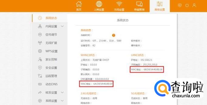 进入到高级设置页面,系统状态页面有两个MAC地址,一个是WAN口的,另一个是LAN口的,可以理解为一个输入、一个输出,看来前面看到的都是WAN口的MAC地址,那到底哪个是我们需要的呢;