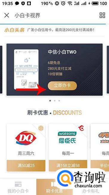 进入小白卡界面,上方会介绍相关的信息,选择一个卡种,点击“立即办卡”