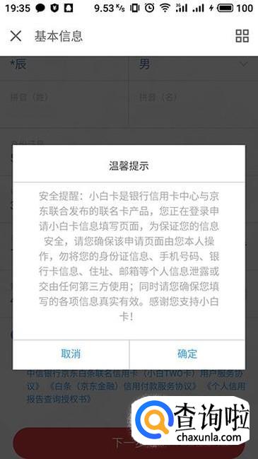 基本信息填写完成之后点击“下一步”,然后弹框提示温馨提示,阅读之后点击“确定”
