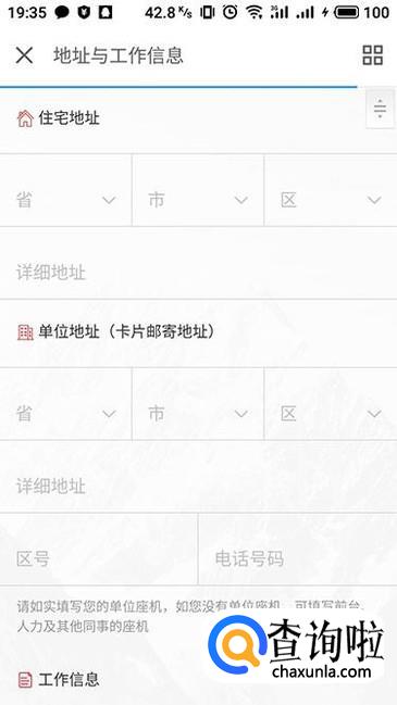 接下来进入地址与工作信息界面,根据系统相关提示填写相应的信息,填写完成之后进行提交,等待审核即可。