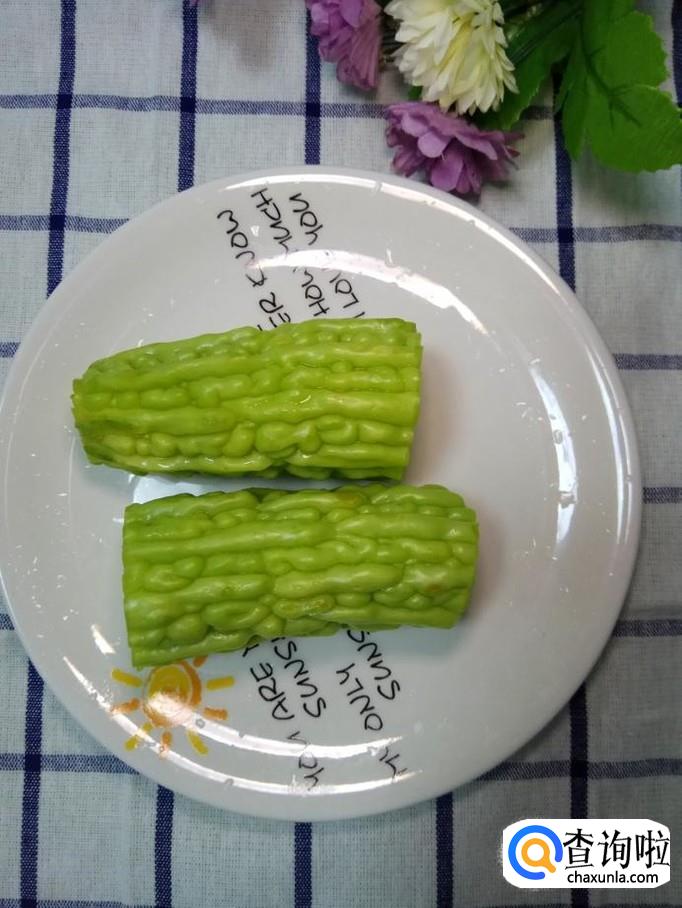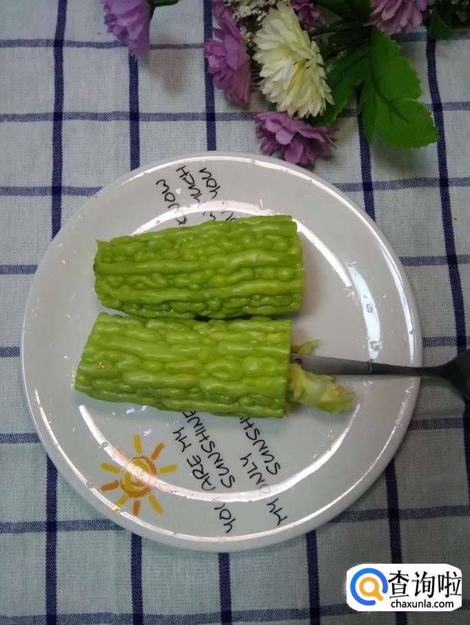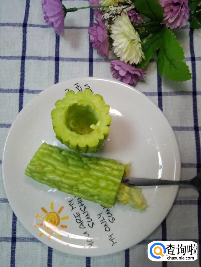 将苦瓜洗净,用勺子掏去苦瓜瓤,注意,可以用勺子的把手将苦瓜瓤掏去,尽量掏干净一些,这样可以降低苦味。