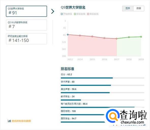 注:QS世界大学排名是世界公认最具影响力的全球性大学排名之一,主要评价指标为:学术领域的同行评价(40%)、全球雇主评价(10%)、单位教职的论文引用数(20%)、教师/学生比例(20%)、国际学生比例(5%)、国际教师比例(5%)