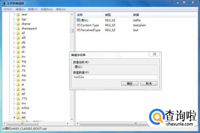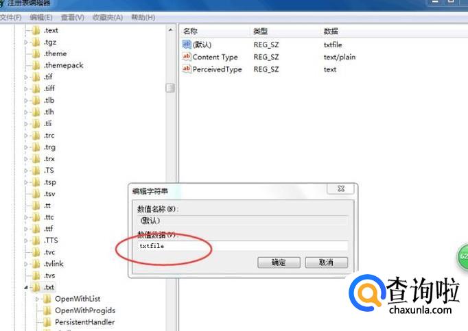 选择右侧的【默认】选项,双击打开它,然后将值改为【txtfile】即可,如下图所示: