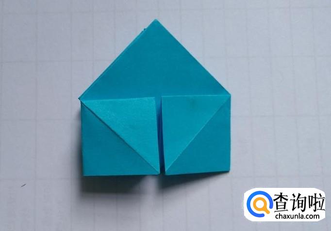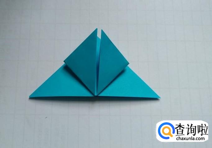 先将折纸上层的三角形的两面分别向上折(第一图),然后把下层同样也折向中心线(第二图)。