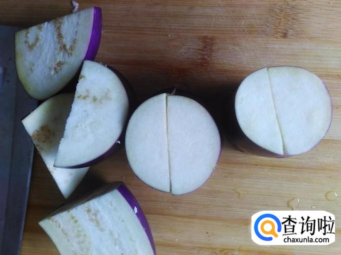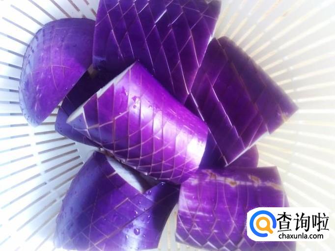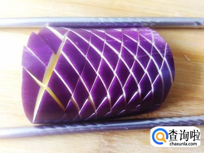 茄瓜切成两寸长一段,再切成两边,把一块茄瓜摆在菜板上,然后摆两个筷子在侧边,侧切连刀像网状。