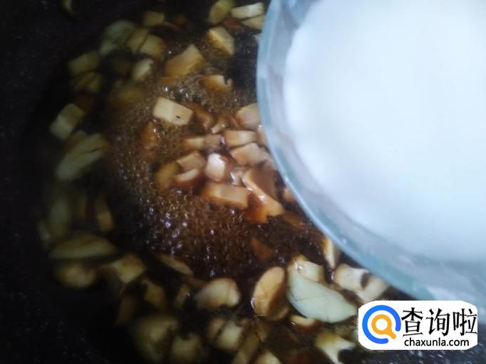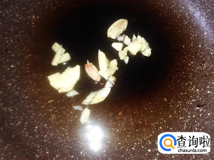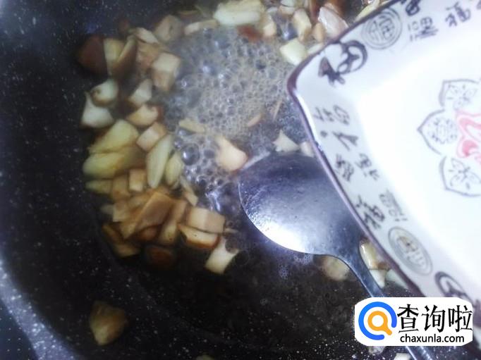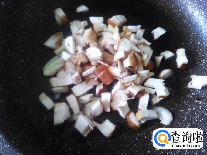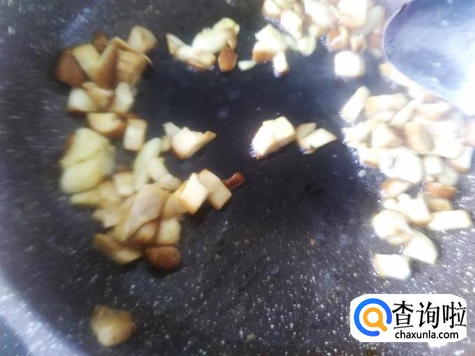 再开火,锅里还剩有油,直接下蒜米进去爆出味来,然后下香菇丁进去。