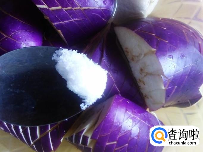 把切好的茄瓜放盘子加适量盐用水泡几分钟,然后捞上篮子沥干水份。