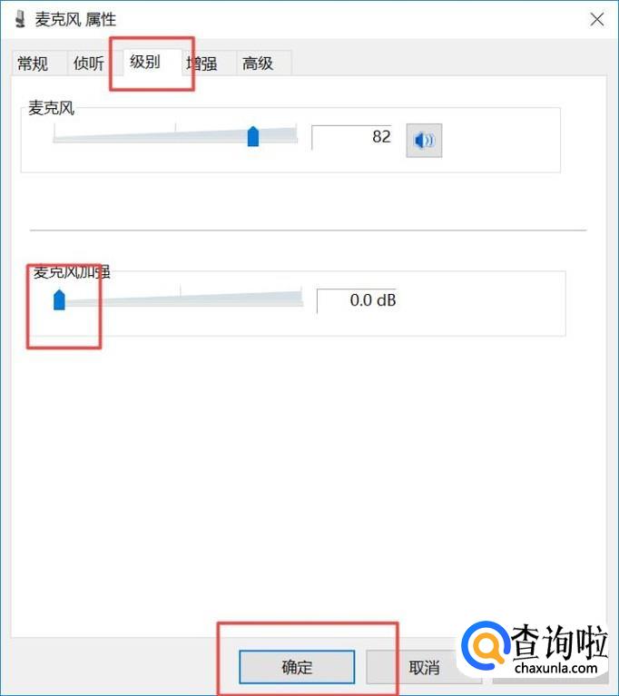 然后我们点击级别,然后将麦克风加强调制最小,之后点击确定;