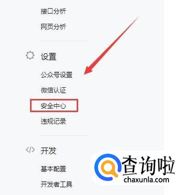 打开并登陆微信公众号,登陆成功后可以在左侧找到并点击“设置--安全中心”按钮,点击它进行下一步的设置操作。