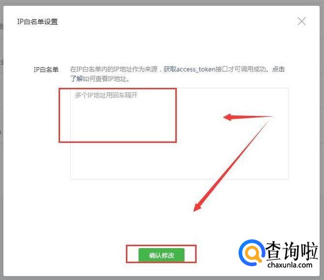 如下点击的是“IP白名单”按钮右侧的“去设置”按钮,会打开一个小窗口,按照提示输入需要屏蔽的IP段后再点击下方的“确认修改”按钮,进行修改并保存操作。