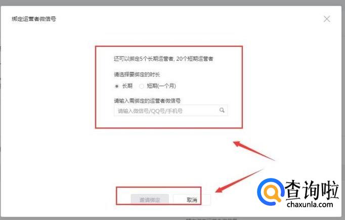 点击后会打开如下页面,按照提示进行选择:长期、短期(一个月)单选按钮,选择完成后再点击下方的“邀请绑定”按钮进行绑定操作。