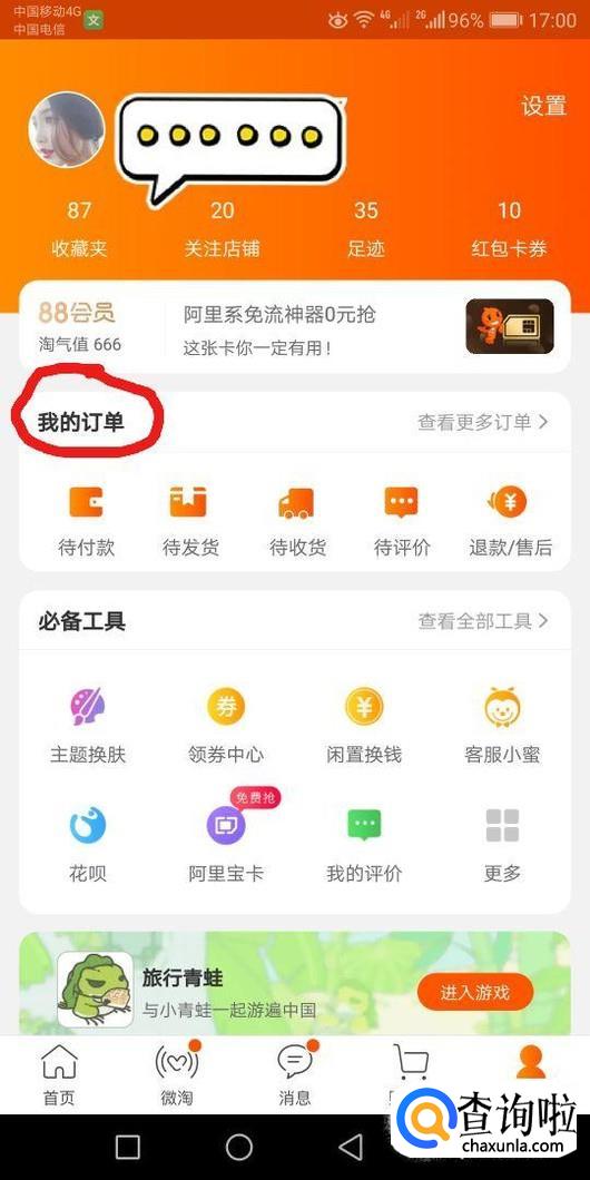 首先打开你的手机淘宝,进入“我的淘宝”页面。点击我的订单进入