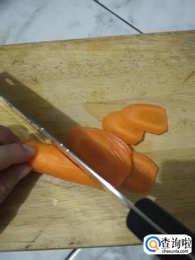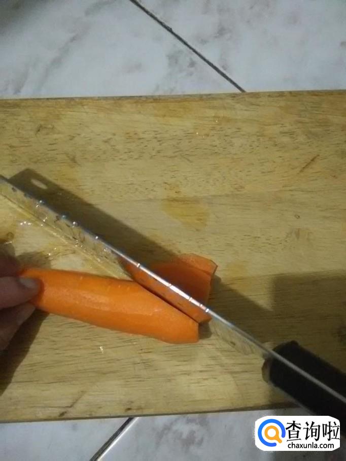 切胡萝卜片时,斜着下刀,每一刀的距离要一致,这样切出的胡萝卜片是椭圆的,而且薄厚一样。