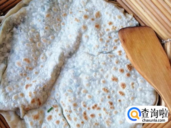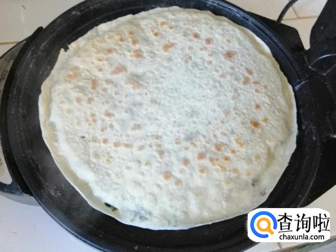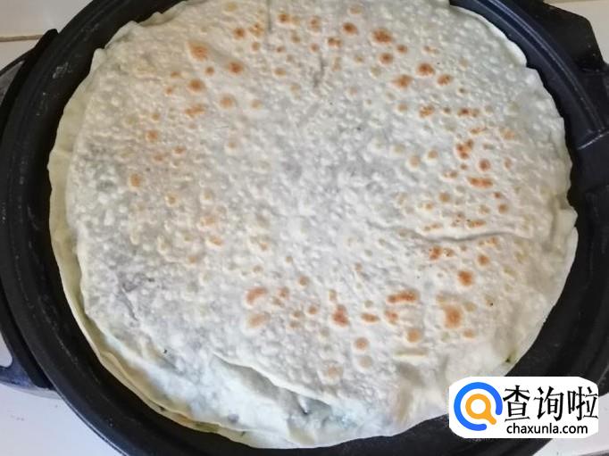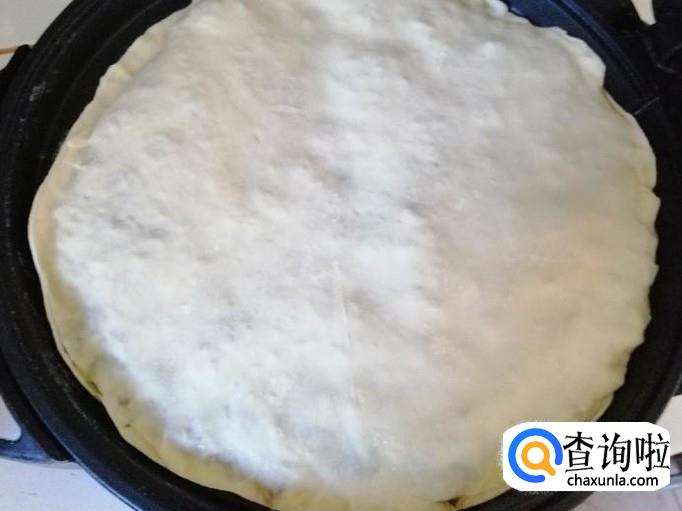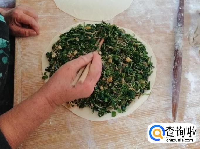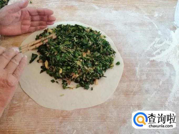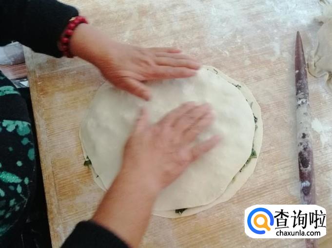 取擀好的一张饼平铺面板上,放适量调好的馅,把馅如图铺平,然后上面盖上另一种饼,用手把两张饼边缘压合就可以了。