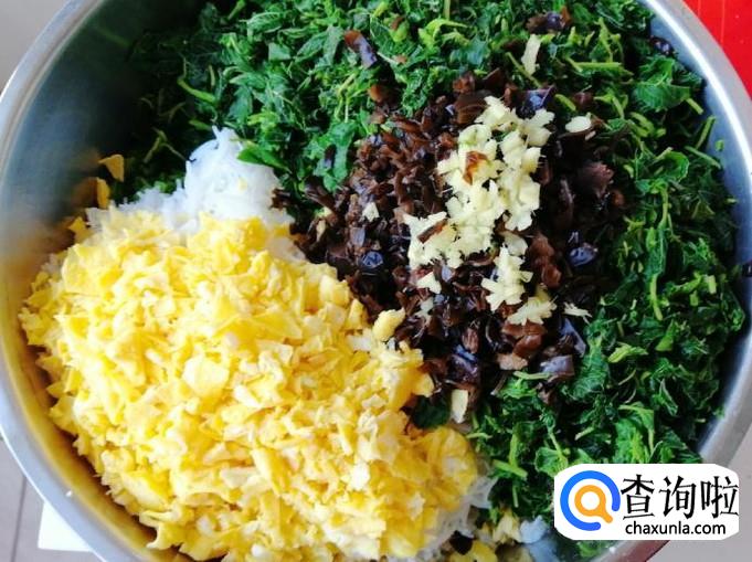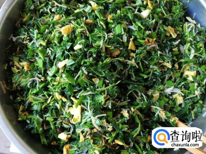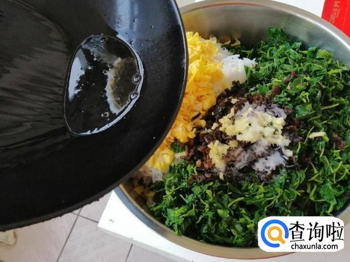 把切好的野苋菜放入调馅盆,再放入切好的韭菜、鸡蛋、粉丝还有剁碎的木耳,喜欢吃姜的可以加些姜末,我这里少放了些姜末,炒锅放油油热后浇在姜末上,然后把馅拌匀,最后加一点老抽,适量食盐,五香粉再次搅拌均匀就可以了。