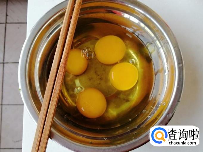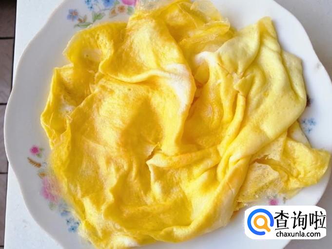 我这里是用了四个鸡蛋,把鸡蛋全打在容器里,煎过放油,煎成如图这样的鸡蛋饼,然后把鸡蛋饼切碎待用。