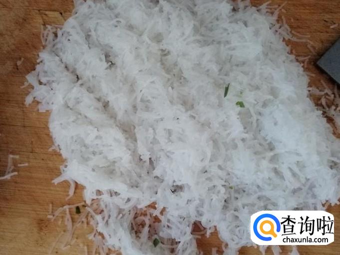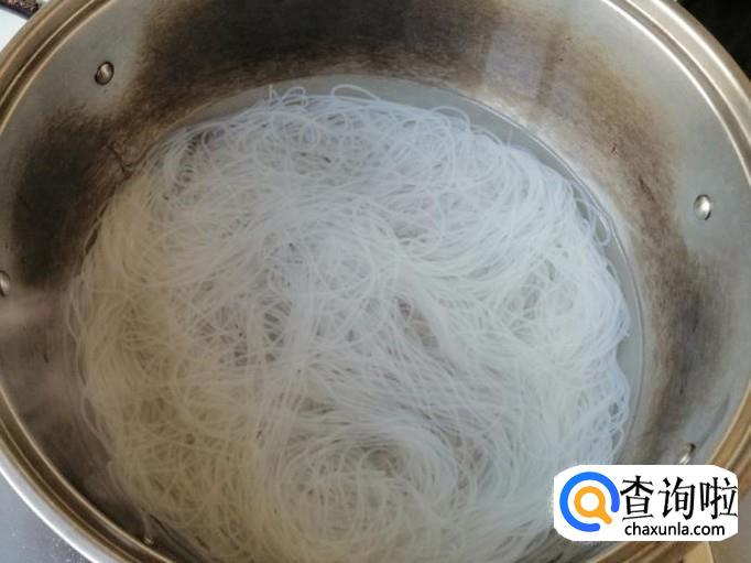 适量粉丝用清水冲洗干净,煮锅放水烧开,放进粉丝烫一两分钟就可以了,把烫好的粉丝捞出放凉后剁碎待用。