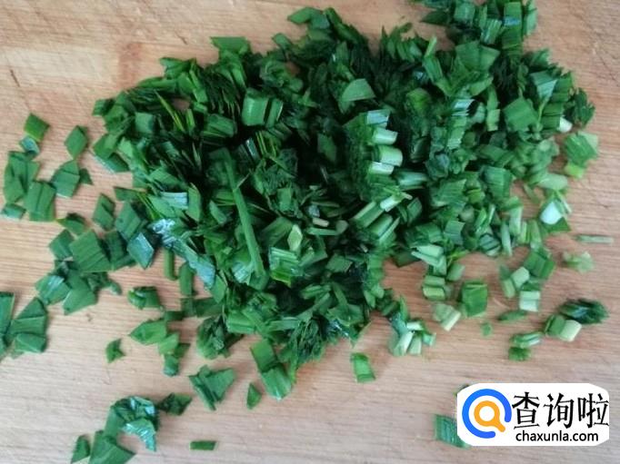 一小绺韭菜,洗净切碎待用。这里所用的一点韭菜主要是提味,喜欢韭菜味的可以多放些,不喜欢韭菜的可以忽略这一步。