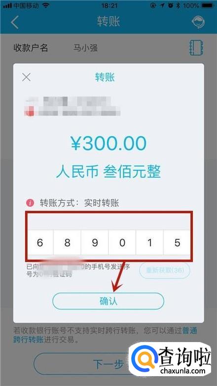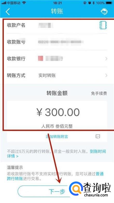 接着输入你要转账的账户信息和转账金额,如下图所示。