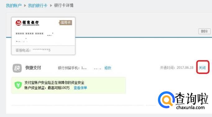 如图所示,点击进入银行卡管理,就可以在右侧看到一个“关闭”按钮,点击一下。