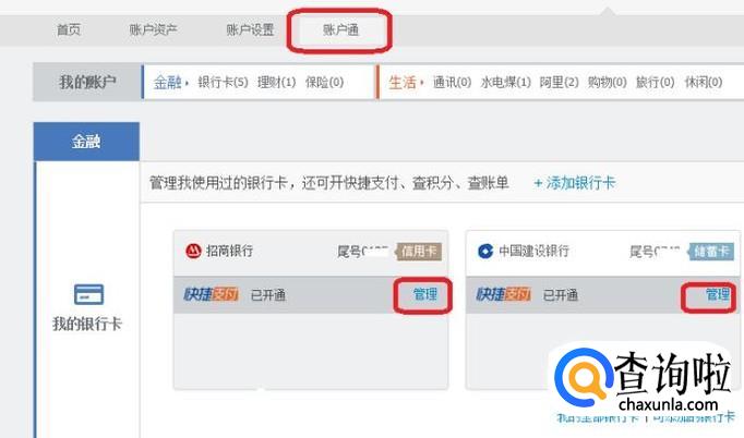 登录之后,就进入支付宝页面,如图所示,我们点击“账户通”标签,就能看到支付宝绑定的银行卡,我们可以看到,凡是开通了快捷支付的银行卡都有一个“快捷支付”的标志,我们任意点击一张银行卡的“管理”。