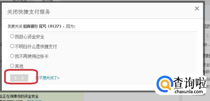 出现提示,我们任意选择一个理由即可,点击下一步,然后输入支付密码,就可以关闭快捷支付了。
