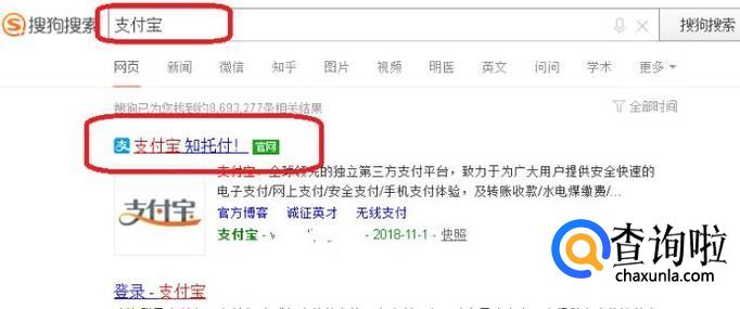 首先,我们需要进入支付宝官网,我们可以用搜索的方式进入,寻找绿色认证的官网,一般搜狗搜索的第一个选项就是,这样比较安全。