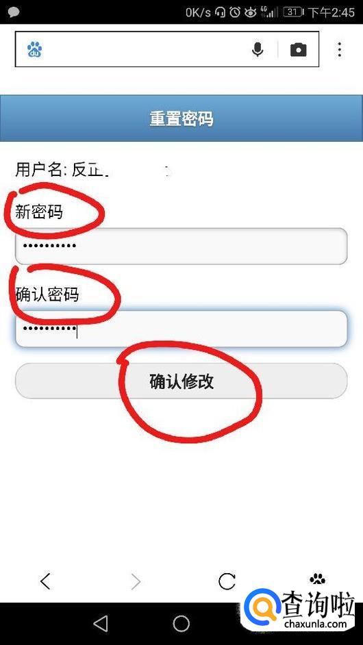 随后根据自己的实际需要重新设置自己的新密码,设置完成后点击“确认修改”,如图所示。