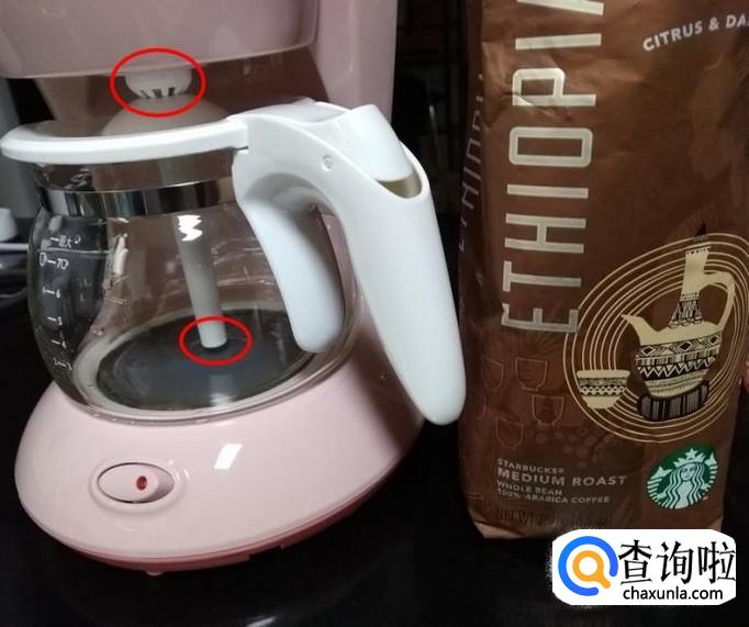 盖上盖子,壶放到咖啡机上,打开电源,等着咖啡从图中标记的地方滴漏下来,不需要等很久;