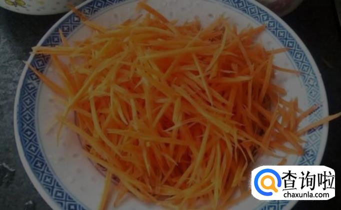 刮去胡萝卜的外皮,洗净 切成细丝,装盘备用