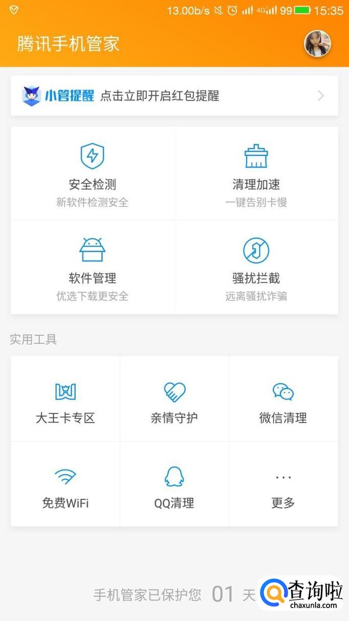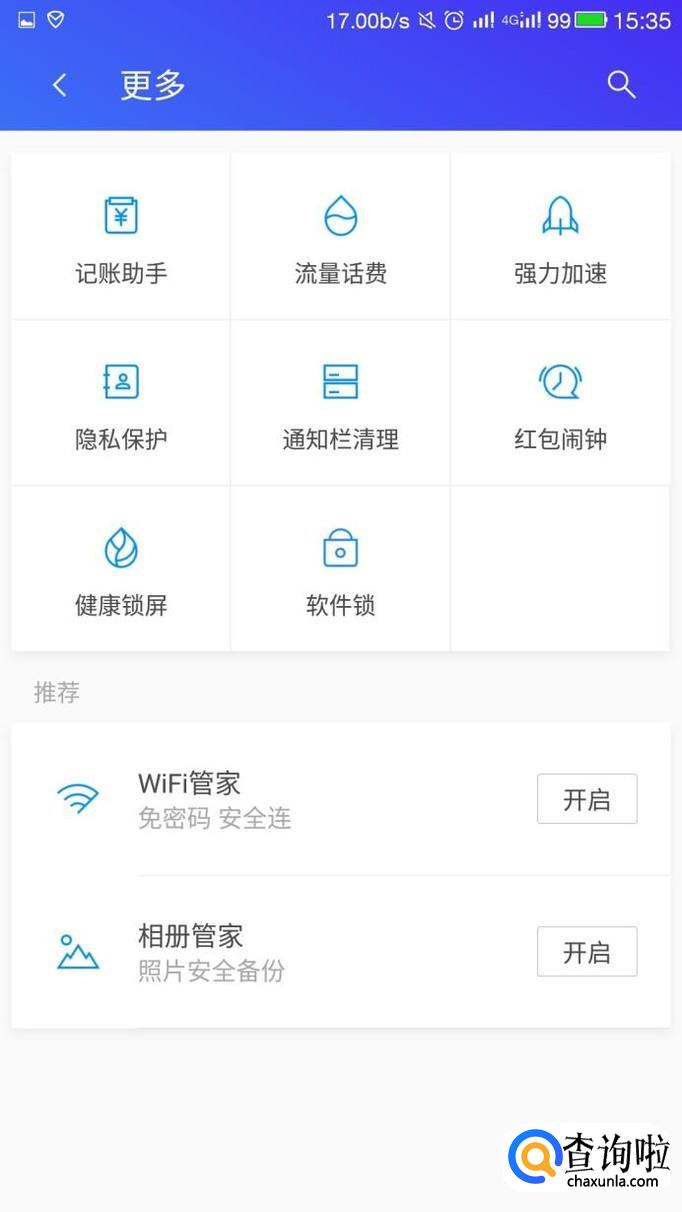 下载一个手机管家,打开后如图所示,向下拉,找到“更多”,点击一下