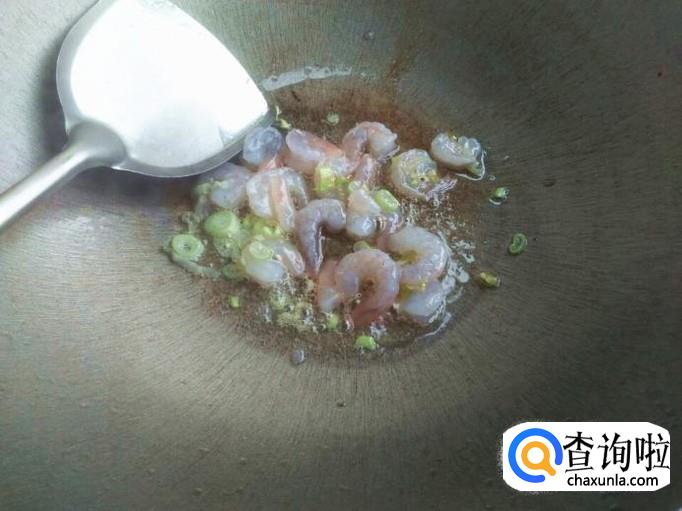 锅里倒上少量的植物油,烧热之后把虾仁和一点葱花放进去进行翻炒,不要长时间翻炒,只要让虾仁在锅里滑几次就可以。