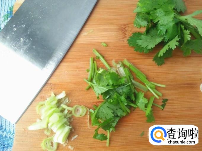咱现在呢也别闲着,洗一棵或者半棵香菜,再准备一点小葱,小葱切成葱花,香菜切成段就好了。
