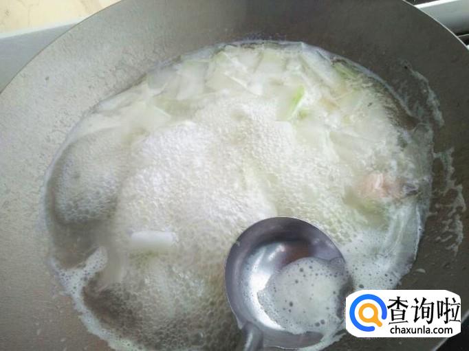 这一步骤大家一定别忘记哈,冬瓜放进去之后,汤里会出现一些沫子,用一把勺子把沫子全部撇出来。