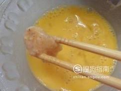 往碗中打入两个鸡蛋,将鸡蛋打散,把每一块鸡胸肉都均匀的蘸满鸡蛋液。