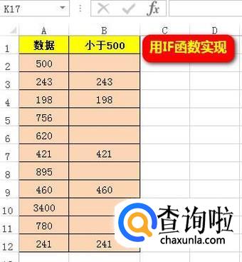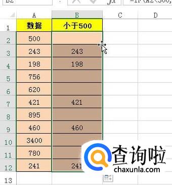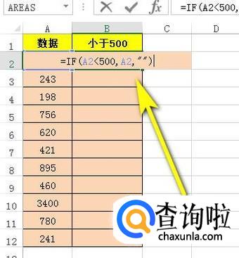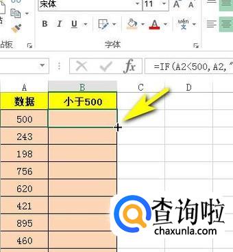 在B2单元格输入公式:=IF(A2<500,A2,"")