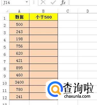 下面举例说明if函数的用法。例如下图中的表格,要把A2:A12这区域单元格内数值小于500的提取到B2:B12对应单元格中。